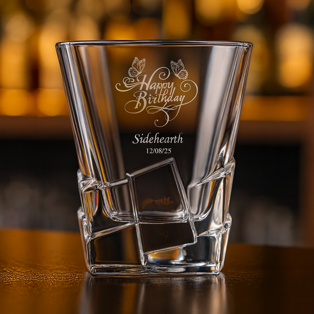 Celebrate birthdays in style with this beautifully custom engraved whiskey glass. Deeply etched with a “Happy Birthday” design, name, and date, this personalized tumbler makes the perfect keepsake for dads, husbands, boyfriends, or best friends. Crafted from high-quality glass with a striking geometric base, it offers both elegance and durability. Whether filled with whiskey, bourbon, or scotch, every sip feels special. A thoughtful gift that lasts long after the toast.