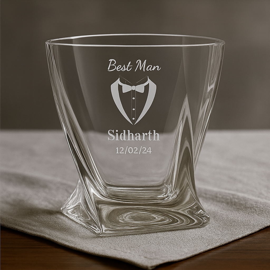 Elevate your groomsman gift-giving with this exquisite personalised whiskey glass. The crystal-clear vessel features a distinctive twisted design that creates mesmerising light reflections, making each sip a visual pleasure. The glass is elegantly engraved with a sophisticated tuxedo motif, accompanied by ‘Best Man’ text, a customised name, and a special date. Perfect for toasting memorable moments, this premium whiskey glass combines both style and functionality. The robust construction and balanced weight provide a luxurious feel, while the unique geometric pattern offers a secure grip. Whether filled with fine whiskey, bourbon, or scotch, this personalised glass transforms ordinary moments into extraordinary memories. Its sophisticated design makes it an ideal keepsake that will be treasured long after the wedding celebrations. The glass arrives ready for gifting, making it a thoughtful choice for expressing gratitude to your best man.