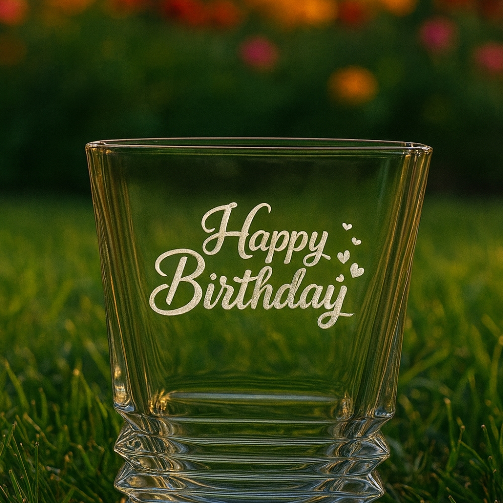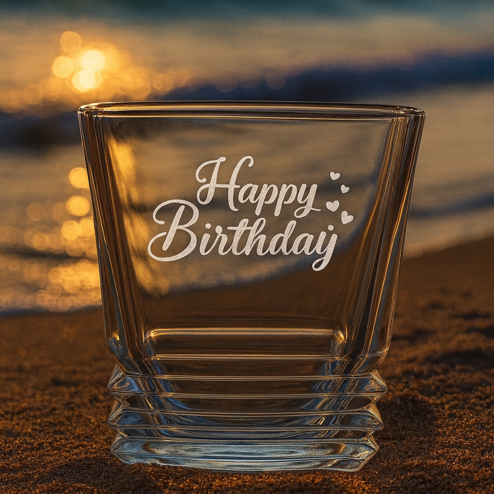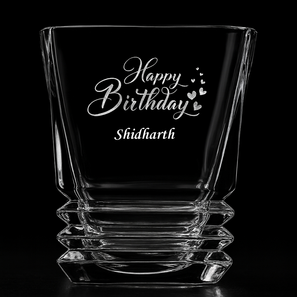 Elevate your whiskey drinking experience with this exquisitely crafted personalised crystal whiskey glass. The distinctive geometric design features a sophisticated stepped base that adds both stability and visual appeal. Perfect as a birthday gift, this premium glass can be customised with a personal name and an elegant ‘Happy Birthday’ message accompanied by charming heart motifs. The crystal-clear glass showcases your favourite spirits beautifully, making every pour a special occasion. Its substantial build and precise cuts reflect light magnificently, creating a luxurious drinking vessel worthy of the finest spirits. The glass combines modern aesthetics with timeless elegance, making it an ideal gift for whiskey enthusiasts or anyone who appreciates fine glassware. Each piece is carefully engraved to ensure lasting quality and a truly personal touch. Whether for serving whiskey, bourbon, or scotch, this personalised glass transforms an ordinary drink into a memorable experience.